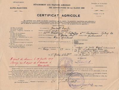Certificat agricole - Détachement aux travaux agricoles des agriculteurs de la classe 1890. (service armé)