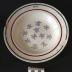Description : Récipient sur plat circulaire (D à la base 9,5 cm), à bords bas, galbées et évasés ( Ht 3,8 cm ; D au rebord supérieur 22,5m ; D du marli 15,8 cm. La partie extérieure de l'aile est décorée d'un liseré vert-sombre, l'intérieur, d'un liseré rouge-sombre. Le fond de l'assiette est décoré de 11 fleurs bleues à 4 pétales allongés et étamines, peintes à la main.