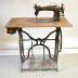 Description : Support en fonte (H : 74,5 cm, L : 63,5 cm, Lg : 40,5 cm) constitué de quatre pieds surmontés d'une structure présentant des lignes courbes, une roue sur le côté droit (D : 44 cm) entraînée par deux pédales adaptées à la forme du pied (32 x 8,5 cm). Cette structure soutient une table de bois ( 90 x 46 cm, ép. 2 cm) décorée de motifs de marquetterie, sous le côté avant gauche de laquelle est disposé un tiroir (L : 38 cm Lg : 13,5 cm H : 9 cm). Un socle de bois peint en noir (40 x 18,5 cm), à droite sur la table, soutient la machine proprement dite, un cylindroïde coudé vers la gauche (H : 30 cm, L : 45,5 cm, Lg : 15 cm), doté à droite d'une roue (D 15 cm), en principe reliée par une courroie à la grande roue inférieure et à gauche d'un système d'aiguille. La machine est, comme le support horizontal, décorée de motifs floraux stylisés multicolores. Caisse de protection en bois (L : 25,5 cm x 50 cm, H : 32 cm)