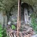 Description : Moulin avec roue à axe vertical. On voit les augets métalliques boulonnés. La roue fait un peu moins de deux mètres de diamètre. Elle se trouve en partie basse du moulin. Elle est alimentée par une canalisation formée par un tronc d’arbre évidé.