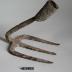 Description : Fourche à 3 dents qui a la forme générale d'un U arrondi dont l'ouverture est de 16 cm de largeur et 22 cm de hauteur. Les dents sont légèrement courbées, elles sont de section rectangulaire et vont en s'amincissant vers l'extrémité. Du centre de la base de la fourche, la tige est recourbée pour former un angle aigu avec le plan des dents. Ell est de section carrée x elle se termine par la douille de fixation du manche (L : 10,5 D : 5 cm).