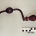 Description : Arbre en "C". Le pivot est rivé à une conscience en bois tourné, montée sur une virole de laiton. La boîte est carré. La mèche est maintenue par une pyramide tronquée évidée et serrée au moyen d'une vis latérale de blocage à oreille. Au médian se trouve une poignée folle ovoïde.