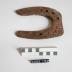 Description : Barre plate en fer forgé, cintrée à plat pour épouser le sabot de l'animal. L'avant a été aplati. Il est percé de 8 trous carrés.