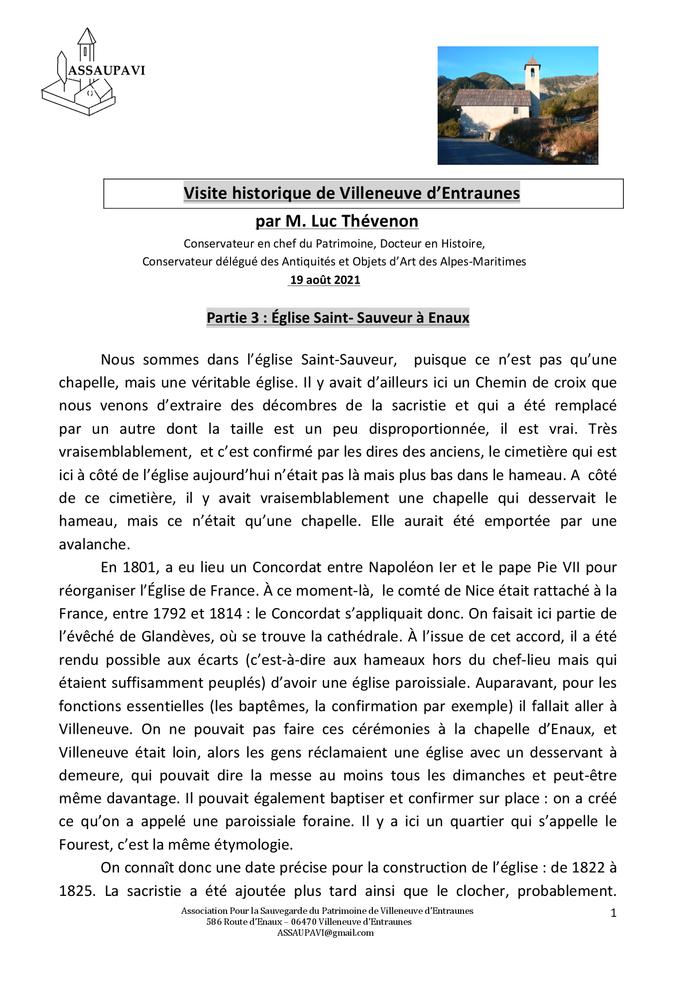 Description : 3ème partie d'une conférence donnée par Luc Thévenon lors d'une visite historique de Villeneuve d'Entraunes organisée par L'Association pour la Sauvegarde du Patrimoine de Villeneuve (Saupavi)1. Luc Thévenon présente l'histoire de l'église paroissiale d'Enaux et détaille son contenu remarquable.
