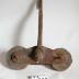 Description : Chariot composé de deux plaques métalliques triangulaires (base 34,5 cm H : 12 cm) Ces deux plaques sont reliées par un cylindre placé au centre. Ce cylindre a un diamètre extérieur de 9 cm. Il est soudé à une des plaques et riveté à l'autre. Il permet le passage d'un axe de 3 cm de diamètre maintenu par un écrou à 6 pans et une rondelle. Les deux plaques sont percées à leurs extrémités par des trous permettant le passage des axes de deux roues à gorge (D ext 16 cm). L'axe central supporte une barre rectangulaire (4x2,5 cm) légèrement courbée terminée à une extrémité par un oeil où passe l'axe et un crochet de suspension à l'autre extrémité. (H : 51 cm)