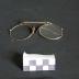Description : Paire de lunettes de vue , composée d'une monture , regroupant 2 ellipses de laiton (4x3 cm), dont l'écartement minimum est de 2,7 cm l'une par rapport à l'autre, reliées entre elles par une barre horizontale sup (L7,7 cm) ; et comprenant également un verre grossissant, logé dans l'ellipse de gauche (il est fendu). Le verre de droite est marquant. La monture ne possède plus de branches.