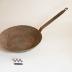 Description : 1989_646-1 : Récipient sur plan circulaire (D à la base 22 cm), à bords moyens et évasés ( H 6 cm, D rebord sup. 31 cm), doté d'un manche ("queue") en fer plat, incliné à 45° (L : 29,2 cm, Lg : 3,1 cm) perforé à son extrémité extérieure d'un orifice elliptique (1,6 x1,2 cm)