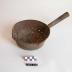 Description : Récipient sur plan circulaire (D à la base 13,7 cm), à bords hauts et évasés (H : 8 cm, D au rebord sup. 18,4 cm) doté d'un manche cylindrique (L : 15,2 cm, D : 2,7 cm) en fer creux, soudé vers le rebord sup. et incliné à 30 ° env. Ce récipient présente nombre de trous circulaires (D : 0,4 cm), disposés régulièrement sur le fond, ainsi qu'en ligne, au bas du bord vertical.